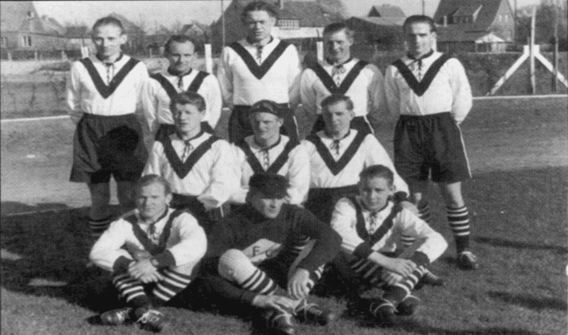 Das erste Mannschaftsfoto der ersten A-Jugend 1952 zeigt(von links): Betreuer W. Wissen,W.Boing, W. van der Beck, H.Kemper, A. Wissen, H. Wassing, H. Lastering, kieend: E.Wassing, H. Walfort, H. Dinslaken, W. Ratering, E. Tenostendarp, T. Frehe